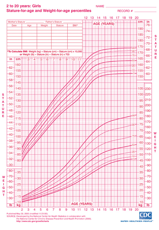 Birth to 36 Months: Girls, 2000(modified 2001), Developed by the National Center for Health Statistics in collaboration with the National Center for Chronic Disease Prevention and Health Promotion (2000), http://www.cdc.gov/growthcharts